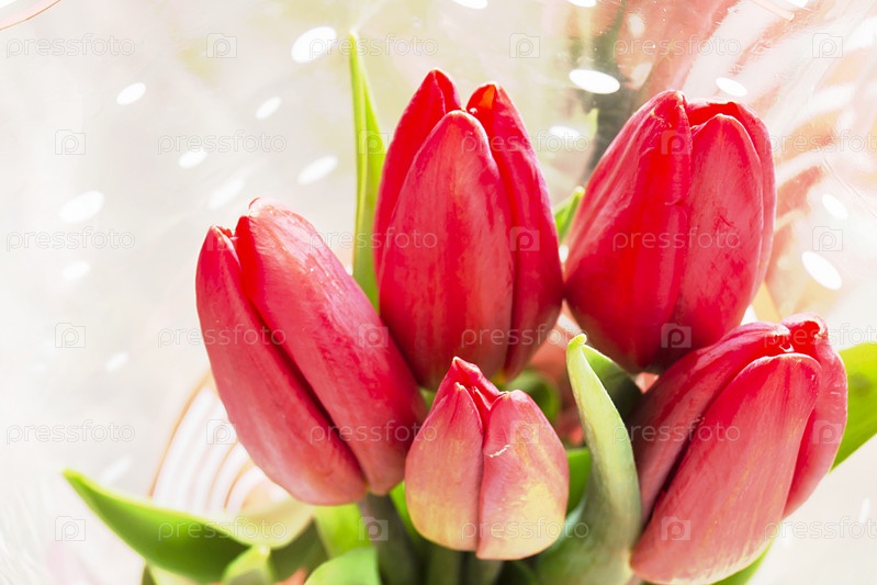 Букет красного тюльпана с зеленым листом