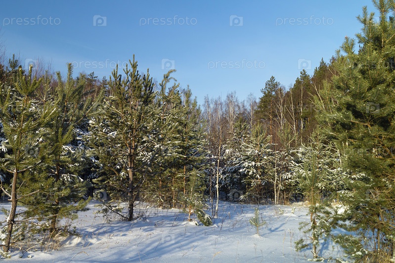 Сосновый лес на фоне голубого неба