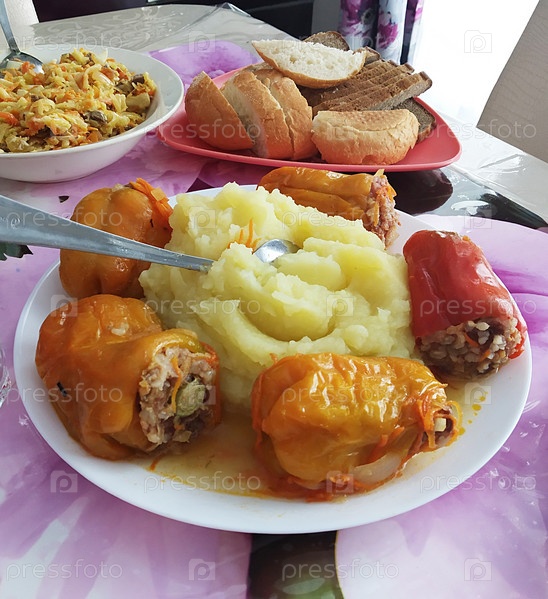 Перец с начинкой и пюре из картофеля в тарелке на столе