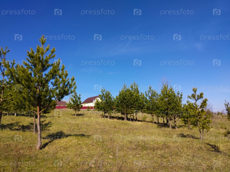 Весенний пейзаж с молодой сосной на лугу в солнечный день