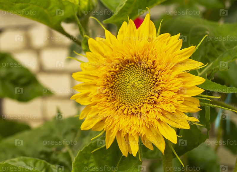 Декоративный подсолнух с зеленым листом растет в саду