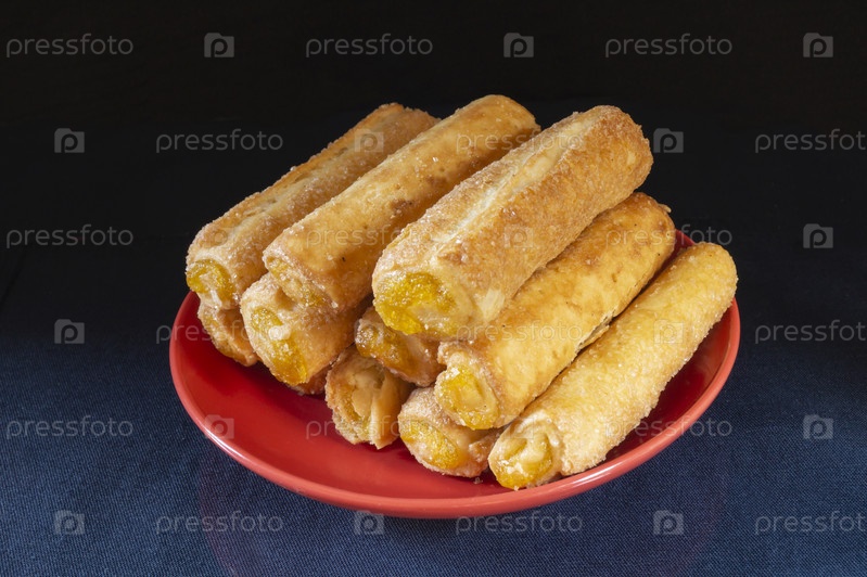 Сладкие палочки с начинкой в красной тарелке на черном фоне