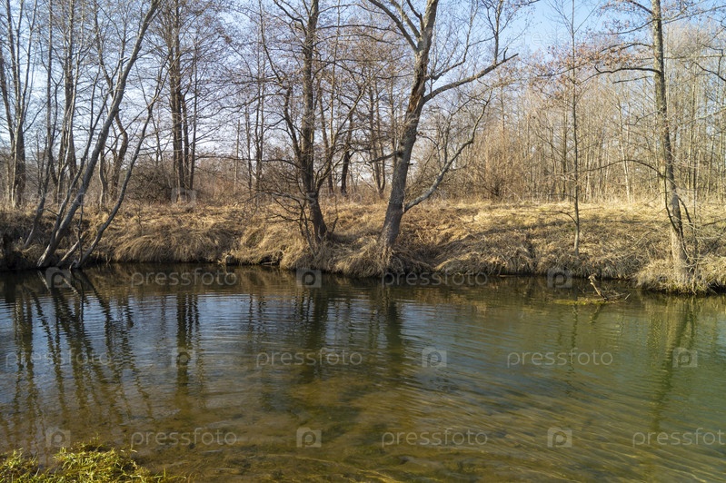 Весенний пейзаж с ручьем в лесу на фоне голубого неба