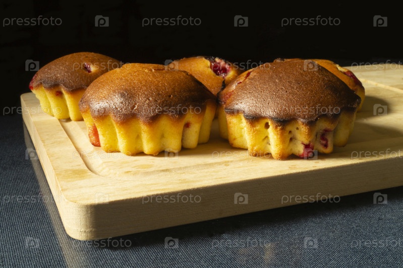 Маленькие фруктовые пирожные с деревянной доской на стеклянном столе