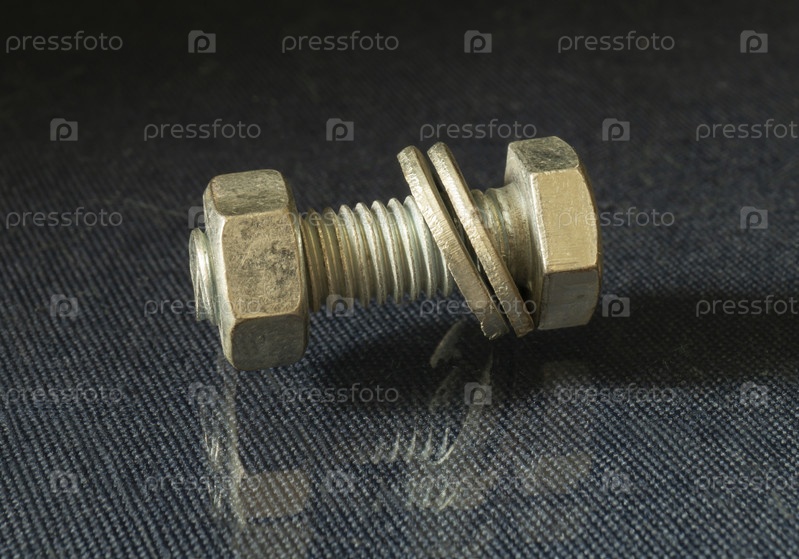 Болт с резьбой гайкой и шайбой на столе с отражением