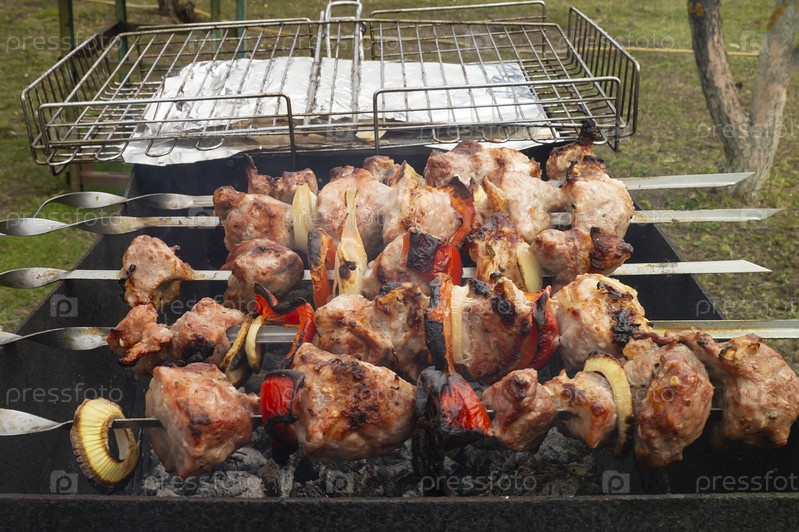 Мясной шашлык с овощами и луком на открытом воздухе