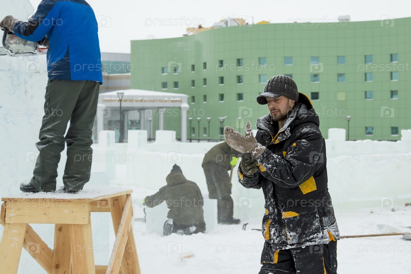 Монтажники на строительстве ледового городка