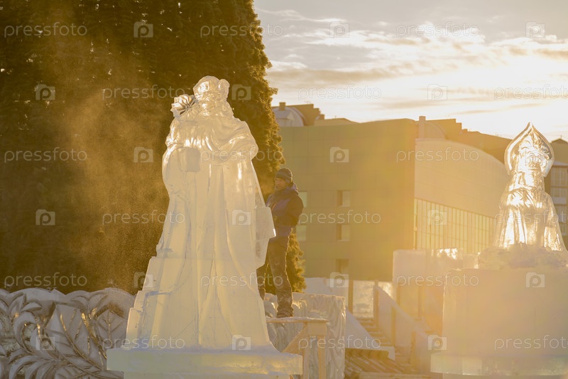 Скульптор вырезает бензиновую пилу Санты из ледяной глыбы