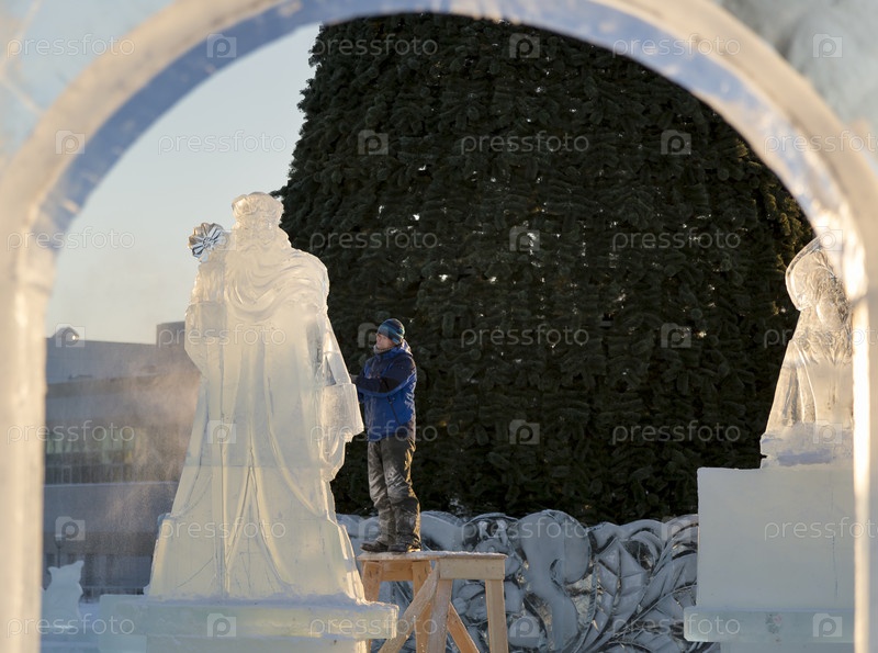 Скульптор вырезает бензиновую пилу Санты из ледяной глыбы