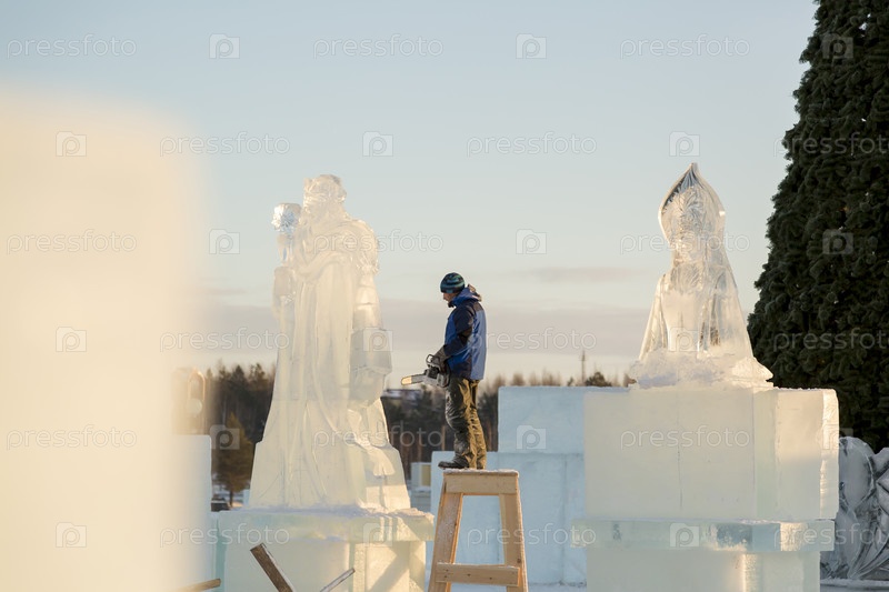 Скульптор вырезает бензиновую пилу Санты из ледяной глыбы