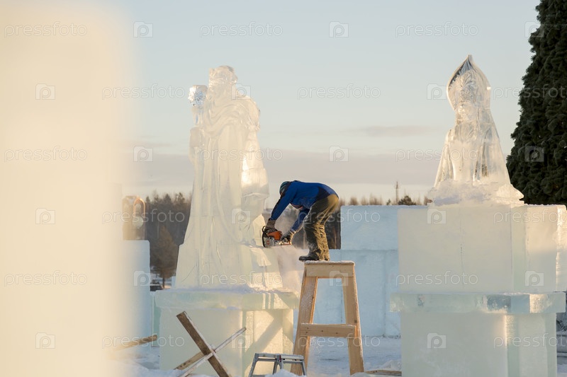 Скульптор вырезает бензиновую пилу Санты из ледяной глыбы