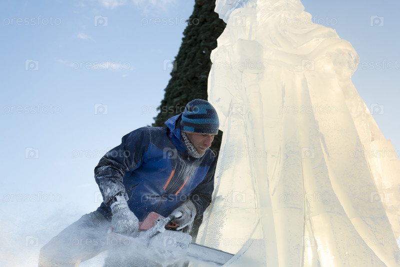 Скульптор вырезает бензиновую пилу Санты из ледяной глыбы