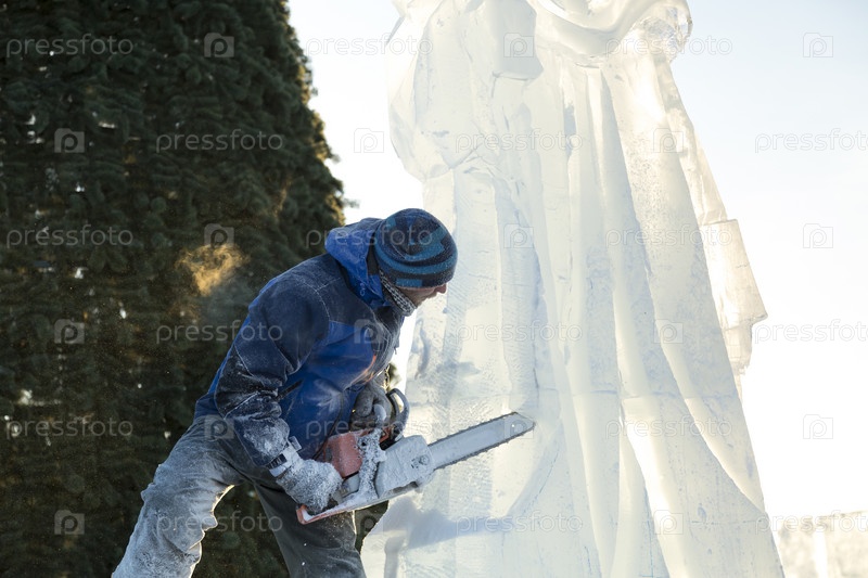 Скульптор вырезает бензиновую пилу Санты из ледяной глыбы