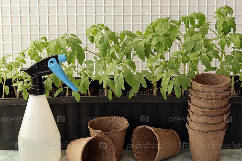 Рассада томатов в пластиковом ящике, торфяные горшочки и опрыскиватель