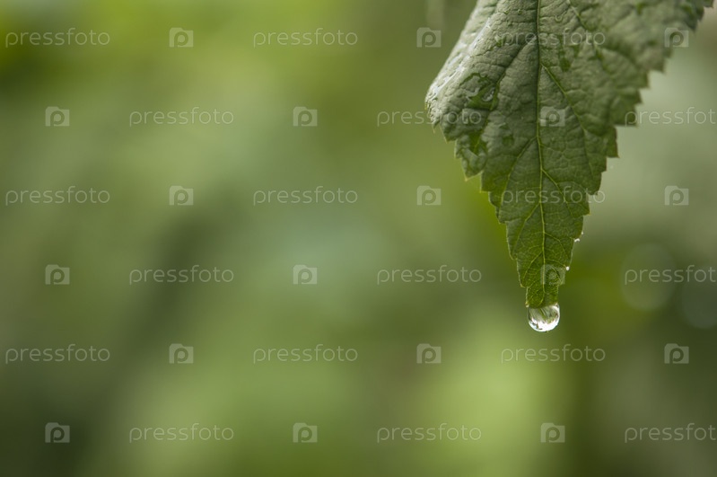 Красивая большая капля утренней росы в природе, выборочный фокус. Капли чистой прозрачной воды на листьях. Весна лето естественный фон
