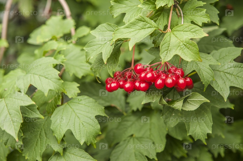 Ягоды и листья калины вибурнум опулус летом на открытом воздухе. Красные ягоды калины на ветке в саду