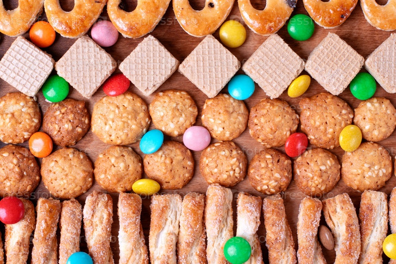 Печенье и вафельный ассортимент рядами и разноцветные конфеты-драже. Вид сверху. Фон кондитерских изделий
