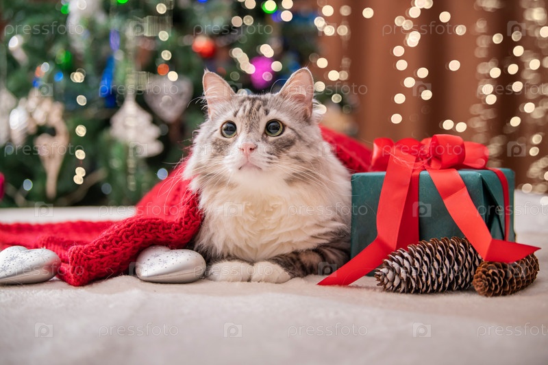 Рождественский кот. Портрет толстого пушистого кота рядом с подарочной коробкой на фоне елки и огней гирлянд