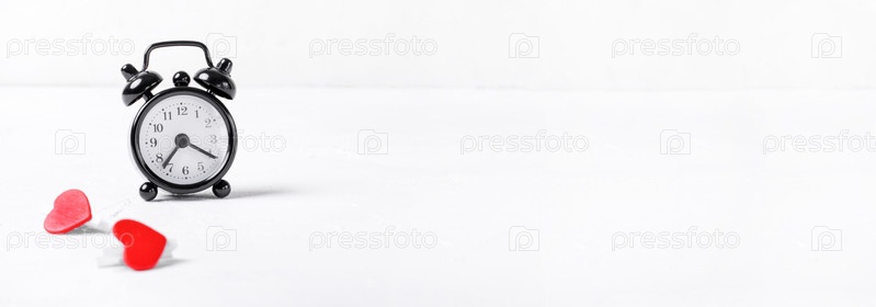 Будильник и два декоративных зажима с сердцем на белом фоне. Широкий баннер с копией пространства
