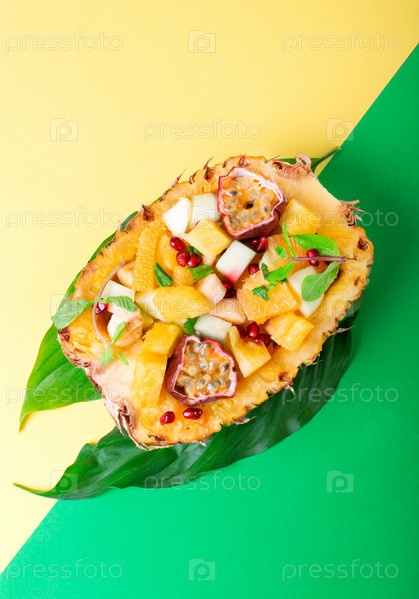 Фруктовый салат подается внутри половинки ананаса. Апельсин, яблоко, банан, ананас, гранат и маракуйя нарезаны и смешаны в натуральной миске