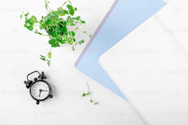 Будильник, синий блокнот, чистая страница и зеленый горошек украшают белый стол. Офисная квартира лежала. Учебное и рабочее пространство