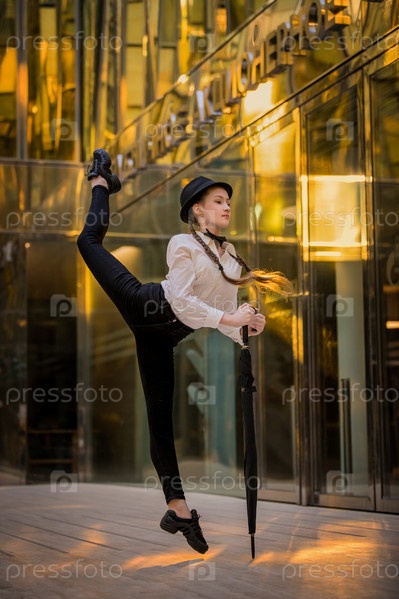 Девушка-подросток танцует современный джаз среди золотых отражений в зеркальных стенах