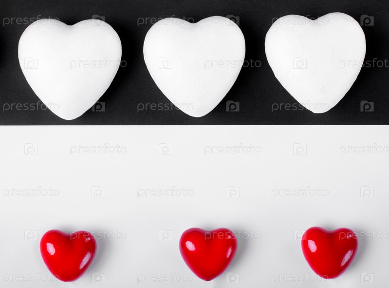 Белые и красные сердца на черно-белом геометрическом фоне. Фон Дня святого Валентина. Концептуальная плоская планировка с копировальным пространством