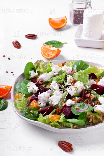 Салат с козьим сыром, запеченной свеклой, мандаринами, листьями салата и орехами пекан подается на белой тарелке