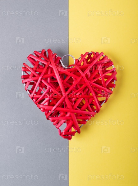 Красное плетеное сердце на сером и желтом фоне. Валентинка