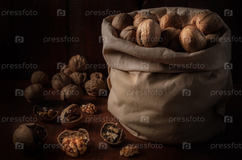 Грецкий орех в мешке из грубой ткани на темном деревянном фоне