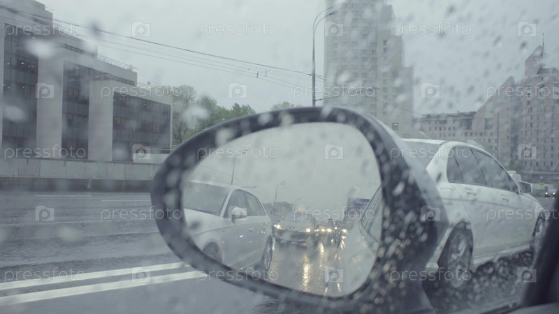 Посмотреть в зеркало заднего вида автомобиля на улице города