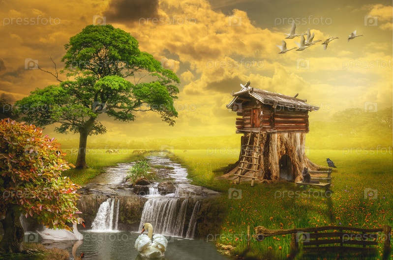 Сказочный домик у озера (иллюстрация вымышленной ситуации, в виде коллажа из фотографий)
