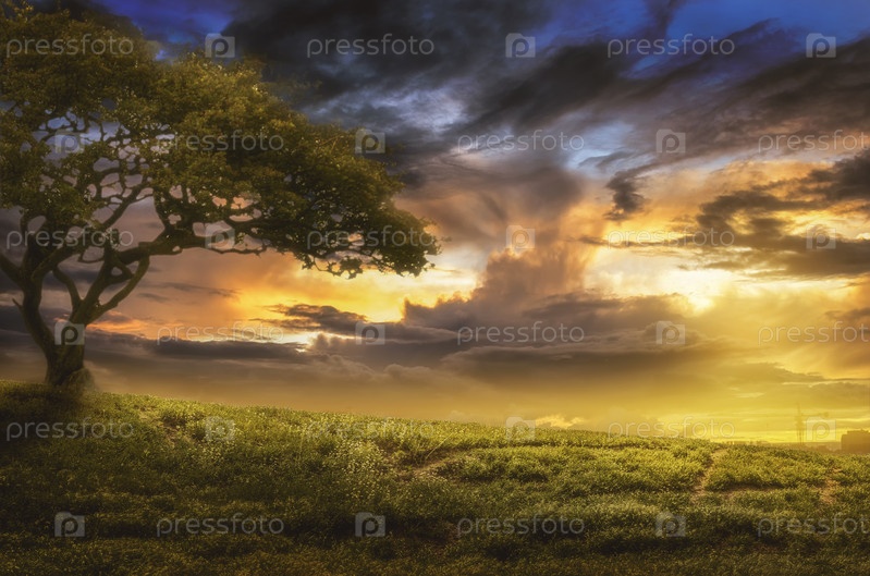 Холм на закате (иллюстрация вымышленной ситуации, в виде коллажа из фотографий)