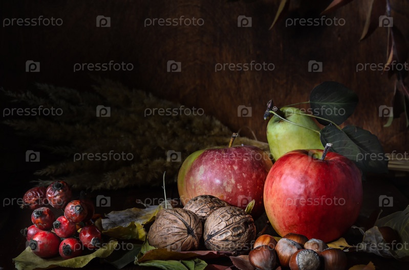 Орехи и фрукты с листвой