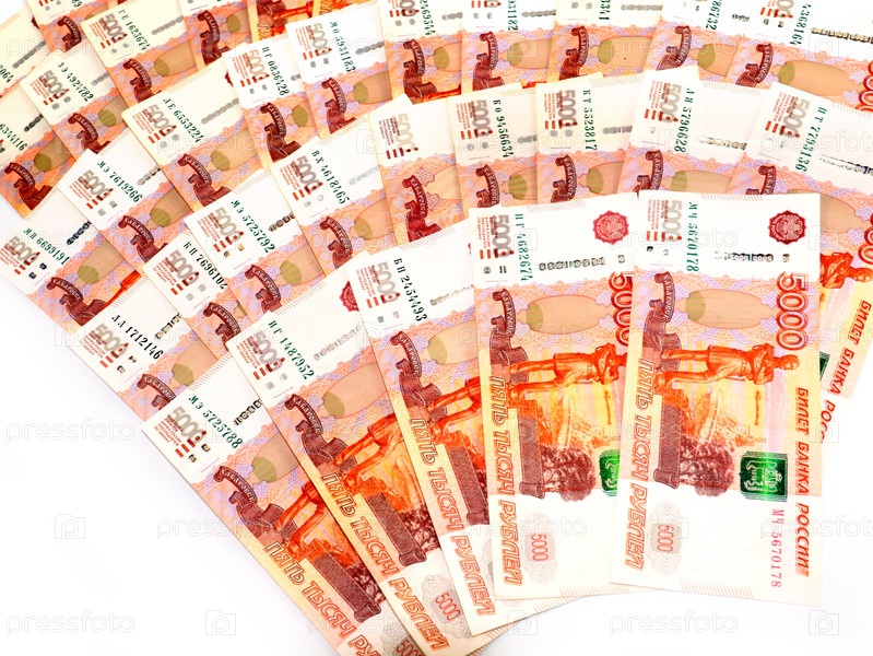 Бумажные банкноты пятитысячных российских рублей, выложенные в виде веера