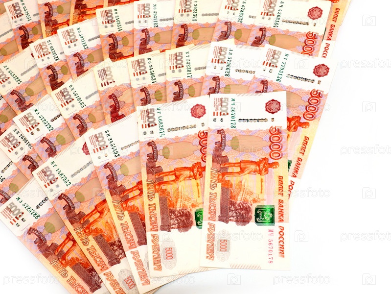 Бумажные банкноты пятитысячных российских рублей, выложенные в виде веера