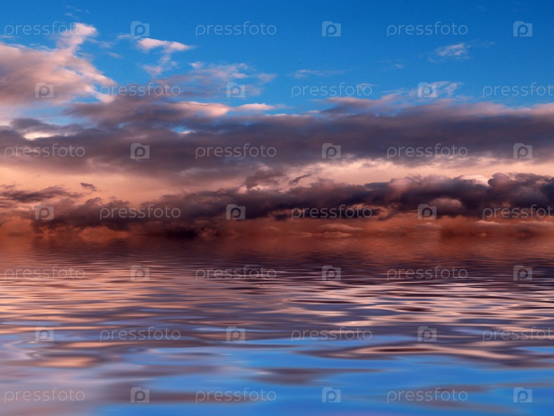 Темные грозовые тучи на закате и спокойная поверхность морской воды