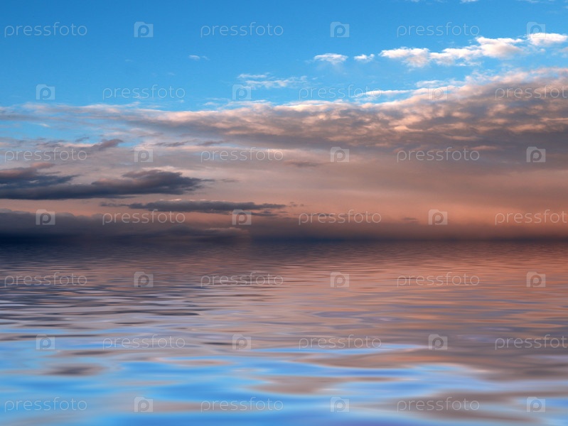 Темные грозовые тучи на закате и спокойная поверхность морской воды