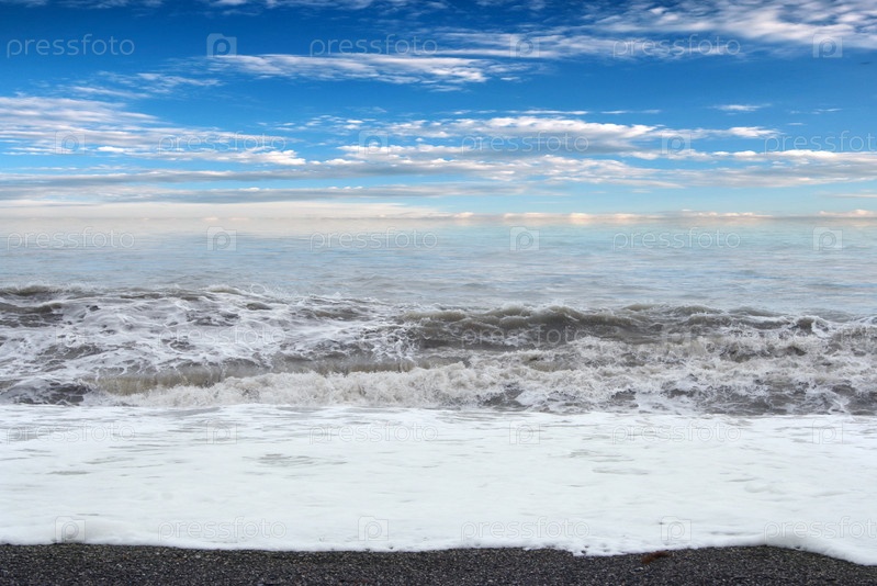 Штормовые волны и галечный пляж на берегу моря