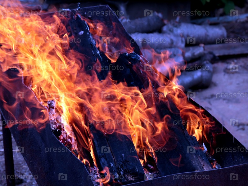 Языки раскаленного пламени в жаровне садового участка