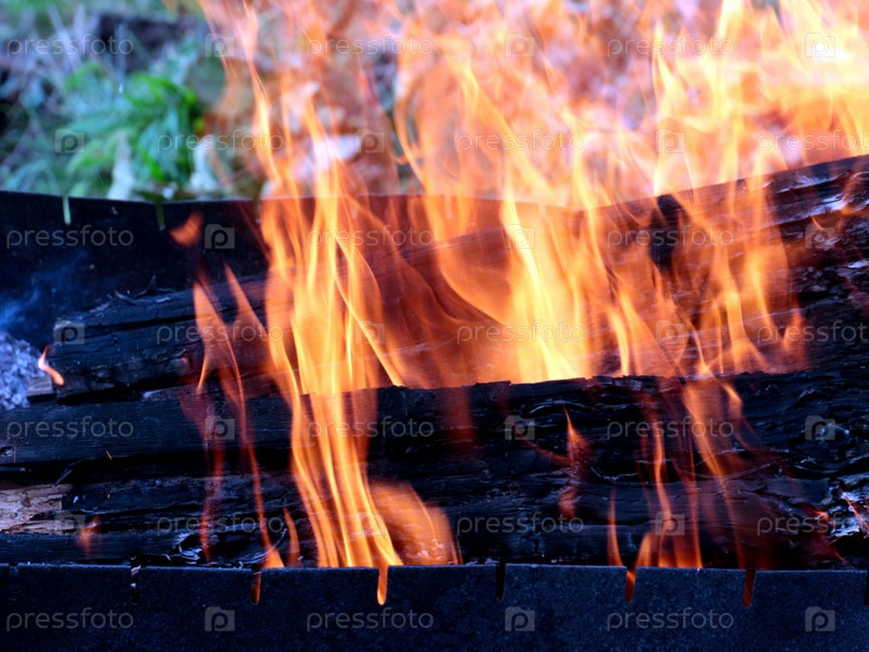 Языки раскаленного пламени в жаровне садового участка