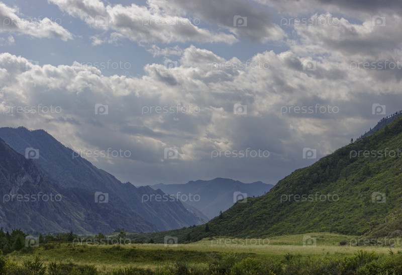 Алтайские горы у реки Катунь на фоне облаков. Зеленые горы и долина. Алтай. Сибирь