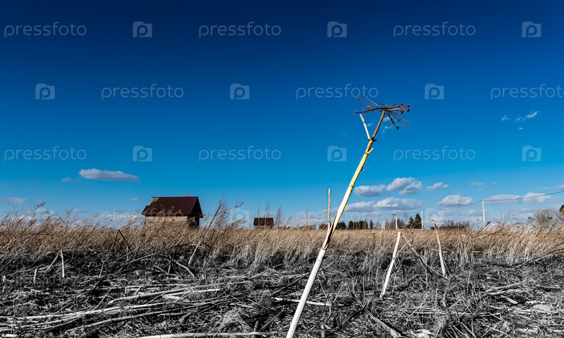 Нежилой дом на фоне засохшего борщевика в заброшенном поле
