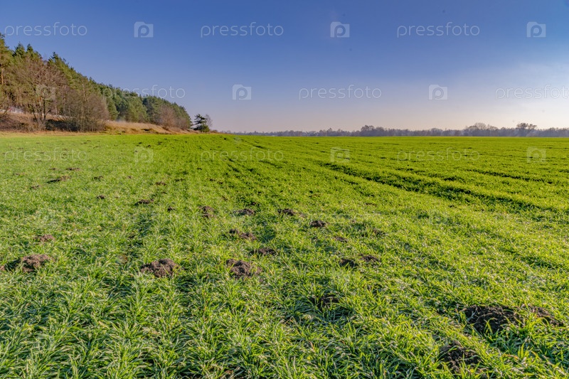 Ярко-зеленая трава на фоне прозрачного голубого неба в солнечный осенний день. Московская область. Пойма реки Клязьмы