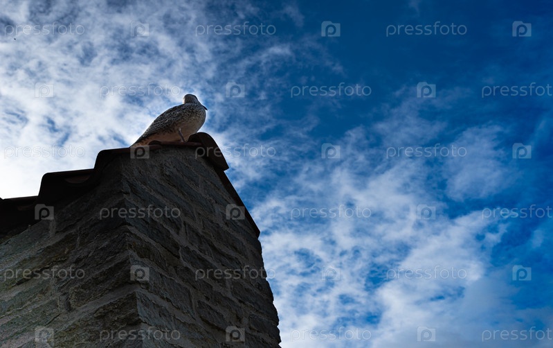 Чайка сидит на кирпичной стене на фоне голубого неба. Таллинн. Эстония