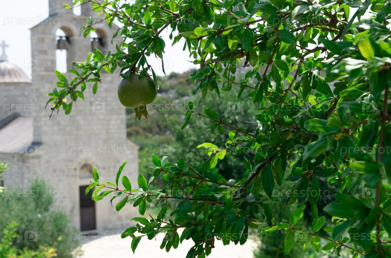 Освященный плод. Зеленый гранат на фоне церкви. Женский монастырь Беска. Богородица. Муричи. Черногория