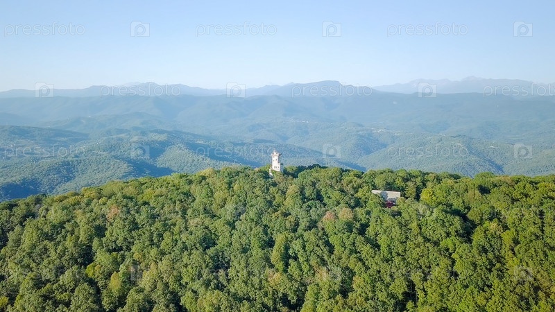 Гора с башней, покрытая лесом. Гора Ахун, Сочи, Россия