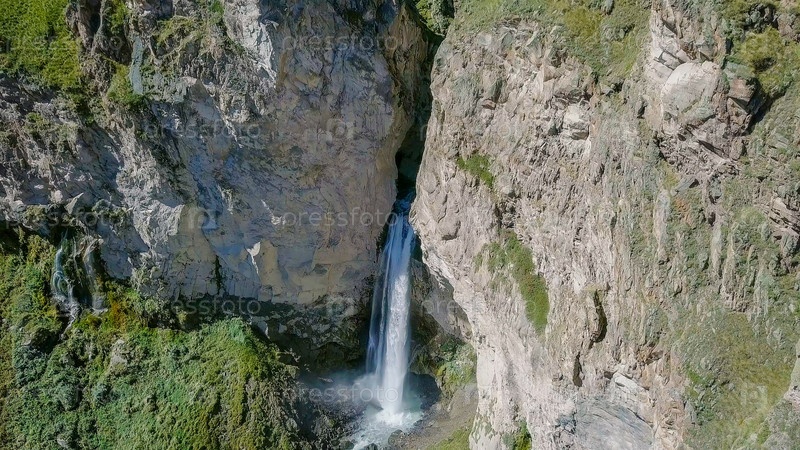 Эльбрус с севера. Водопад Султан на реке Кызыл-Су. С высоты птичьего полета. Кабардино-Балкария, Россия