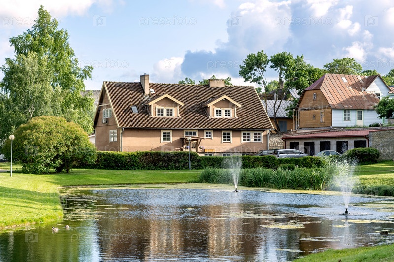 Пейзаж с домом и прудом
