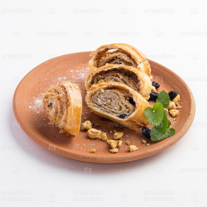 Красивый снимок вкусных сладких рулетиков с грецкими орехами, изюмом и сахаром